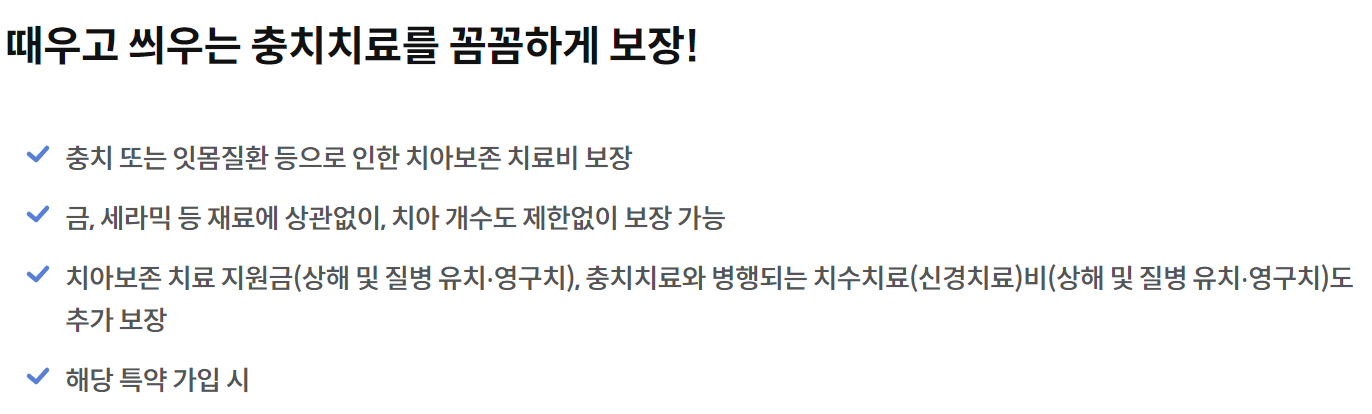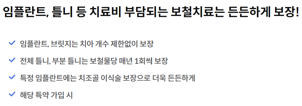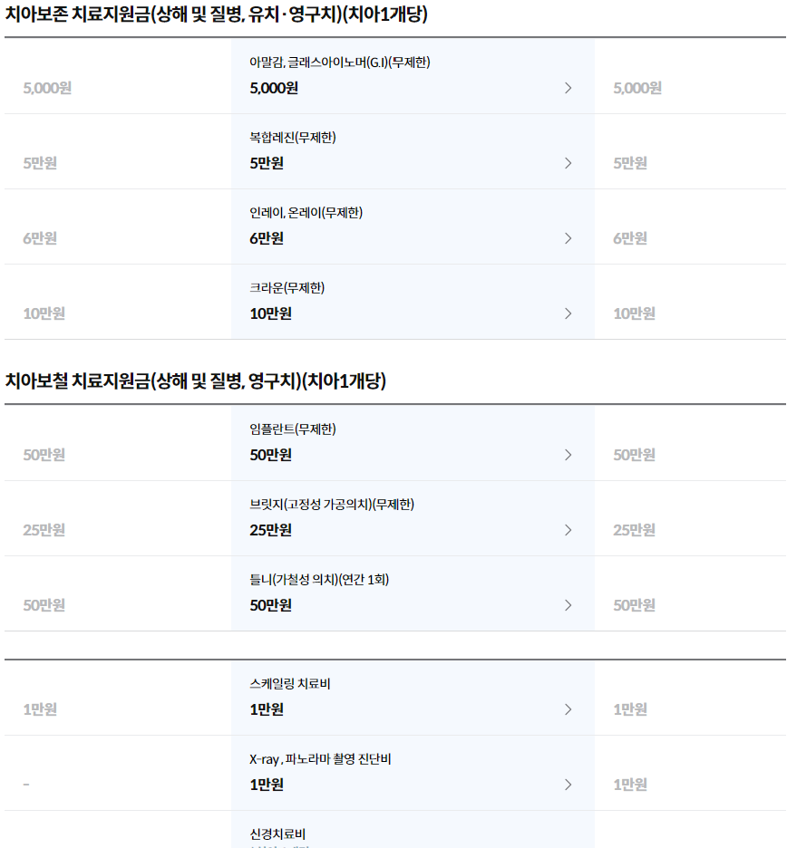 - 질병 91일 이후 보장, 보철치료 2년 미만 50%감액 (단, 상해는 계약일부터 가입금액 100% 보장)