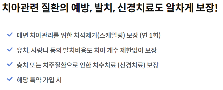 - 치석제거(스케일링) 치료비 보장: 치주질환으로 인하여 급여 적용 치석제거 치료받은 경우 연간 1회한 보장