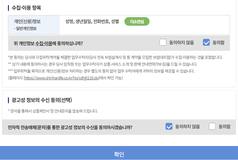 광고성 정보 수신 동의는 동의하지 않으셔도 되며 확인을 누르면 바로 아래와 같이 보험료가 조회됩니다.