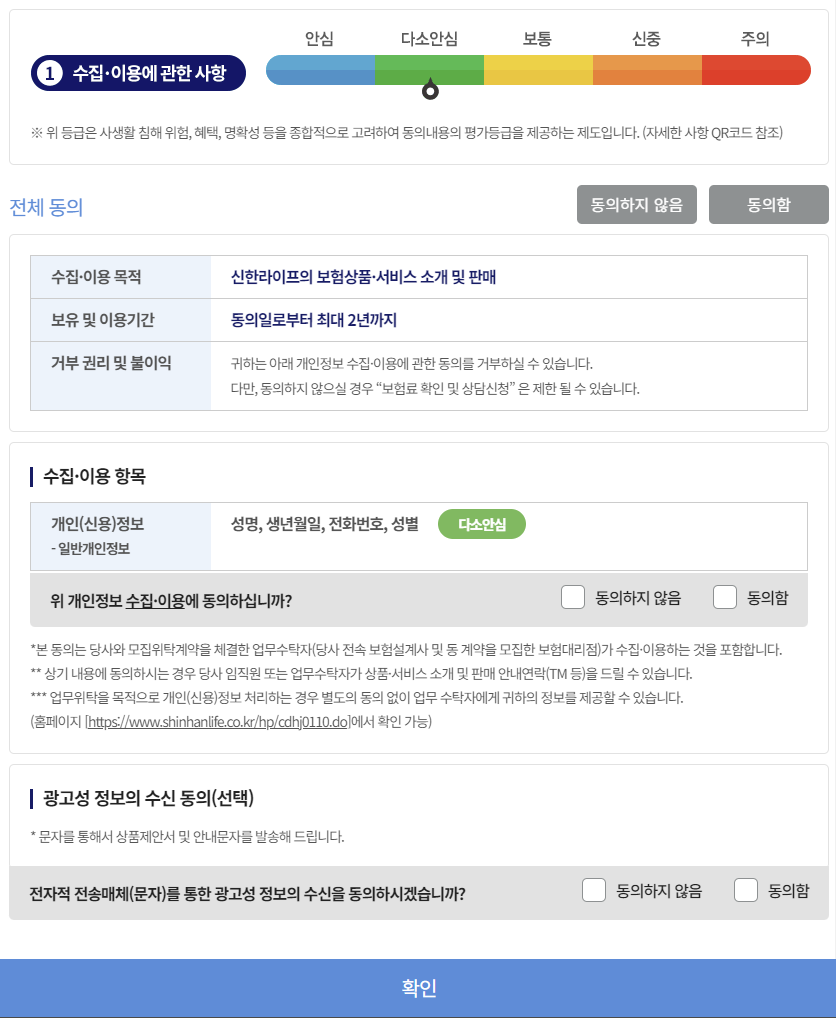 수집 이용 동의를 합니다. 광고성 정보 수신은 동의 안하셔도 됩니다. 그 후 확인을 누르면 아래와 같이 보험료가 나옵니다.