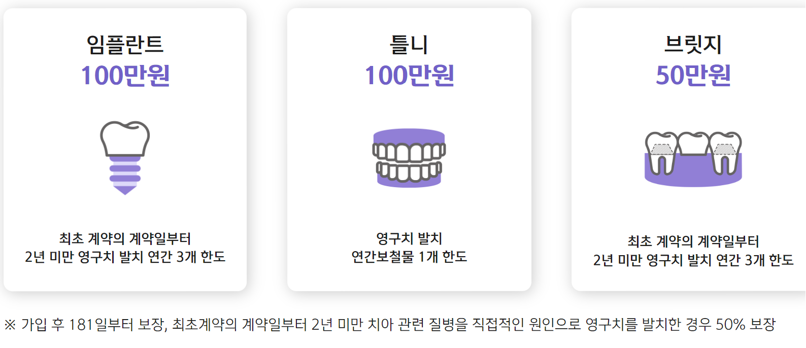 보험기간 중 피보험자가 치아관련 질병 또는 재해를 직접적인 원인으로 보철치료보장개시일 이후에 영구치 발치를 진단확정 받고, 해당 영구치를 발치한 부위에 임플란트 치료를 받았을 때 (영구치 발치 1개당, 최초계약의 계약일부터 2년 미만 영구치 발치 연간 3개 한도, 최초계약의 계약일부터 2년 이후 및 갱신계약의 경우 개수 제한 없음) |
