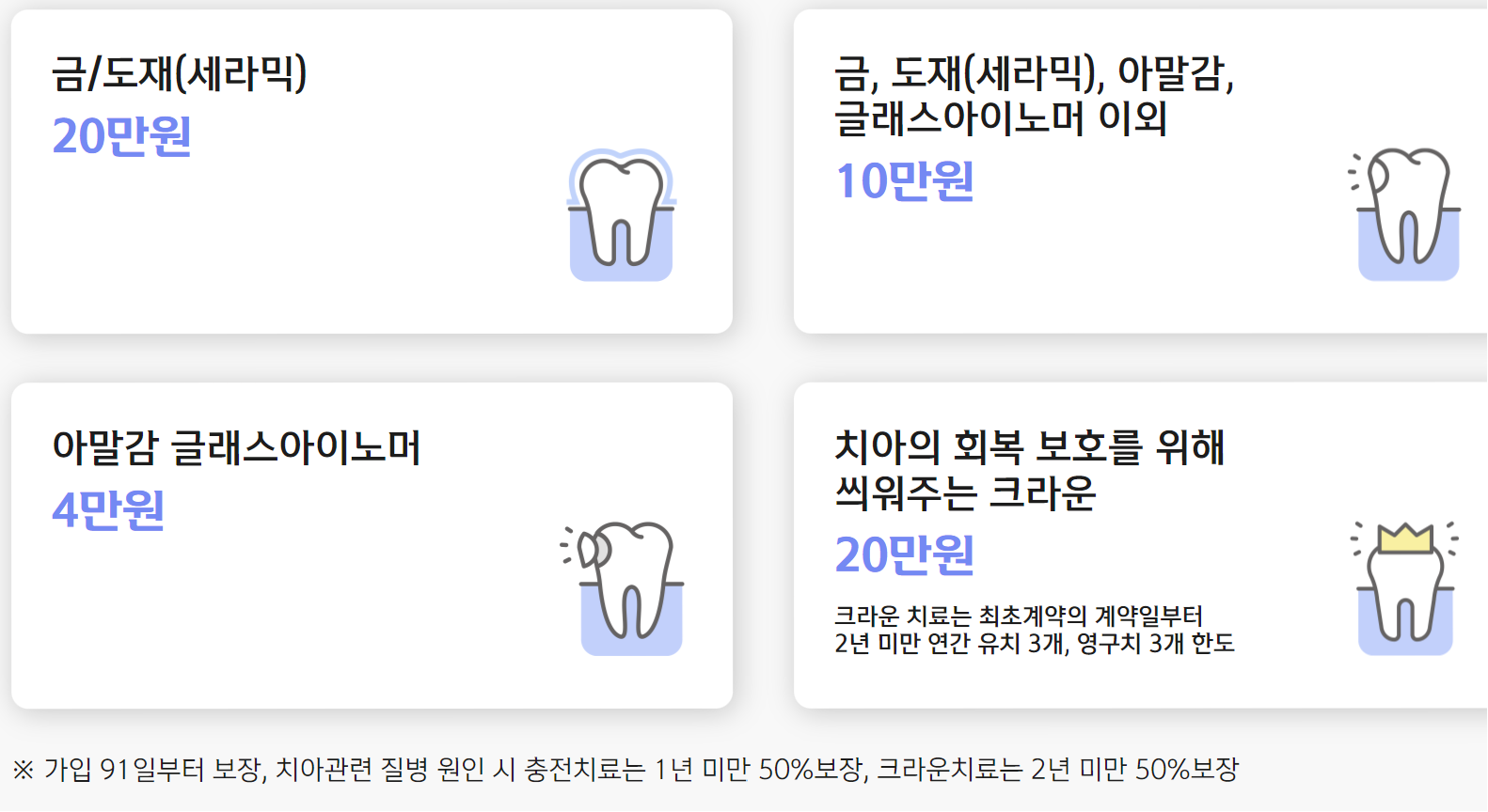 보험기간 중 피보험자가 치아관련 질병 또는 재해를 직접적인 원인으로 크라운치료보장개시일 이후에 크라운치료를 진단확정 받고, 해당 치아에 대하여 크라운치료를 받았을 때 (치료치아 1개당, 최초계약의 계약일부터 2년 미만 연간 유치 3개, 영구치 3개 한도, 최초계약의 계약일부터 2년 이후 및 갱신계약의 경우 개수 제한 없음) |