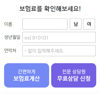 이름, 성별, 생년월일, 연락처 입력 후 간편하게 보험료 계산을 클릭합니다.
