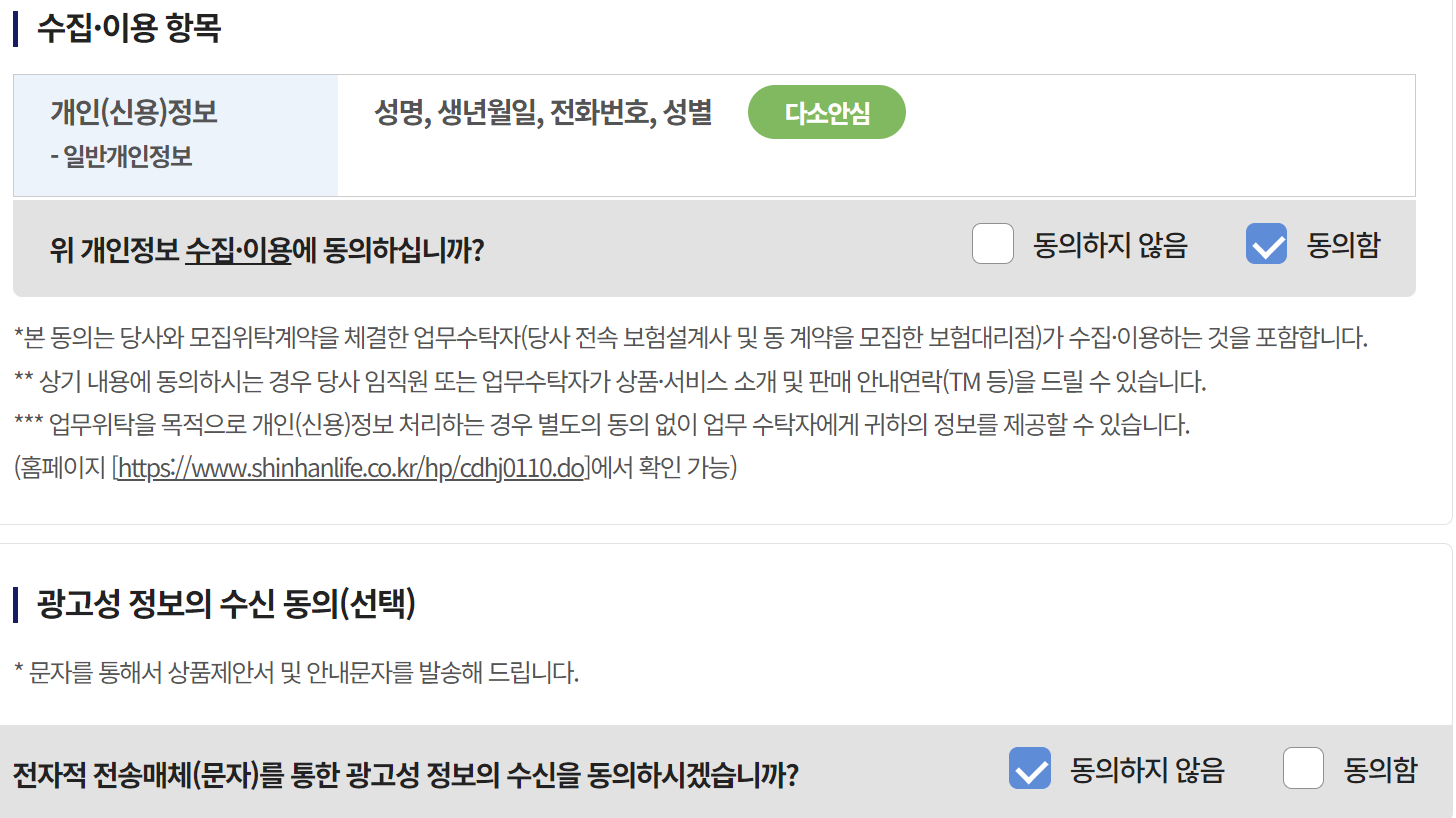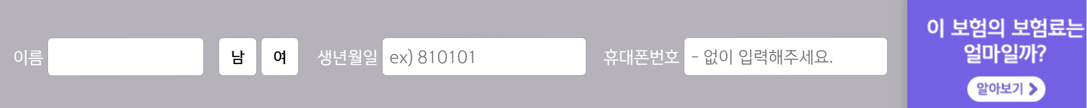 보험료 조회방법은 간단합니다. 이름, 생년월일, 휴대폰번호 입력 후 보험료 알아보기를 클릭하면 수집이용 항목에 동의를 합니다. 광고성 정보 수신 동의는 동의 하지 않으셔도 됩니다.