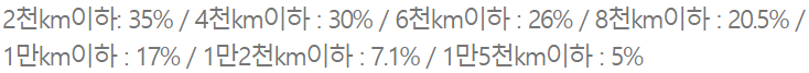 본인이 운행거리가 적다고 생각하시는 분들은 연간 운행거리가 1만 5천 km이하라면 마일리지 특약 가입을 통해 아래와 같이 운행 키로수에 따라 5 ~ 35% 할인을 받을 수 있습니다.