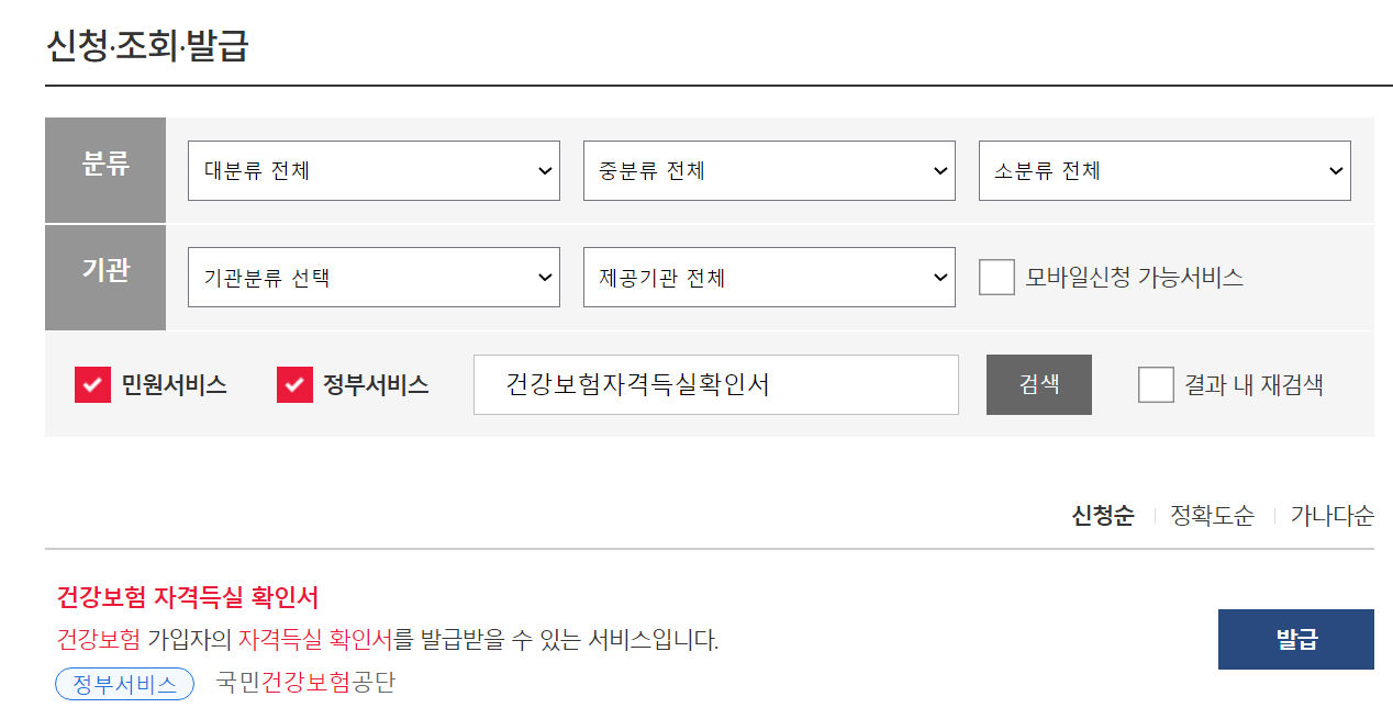 검색창에 건강보험 자격득실 확인서를 검색하면 위 사진과 같이 나오면 발급 버튼이 나옵니다.