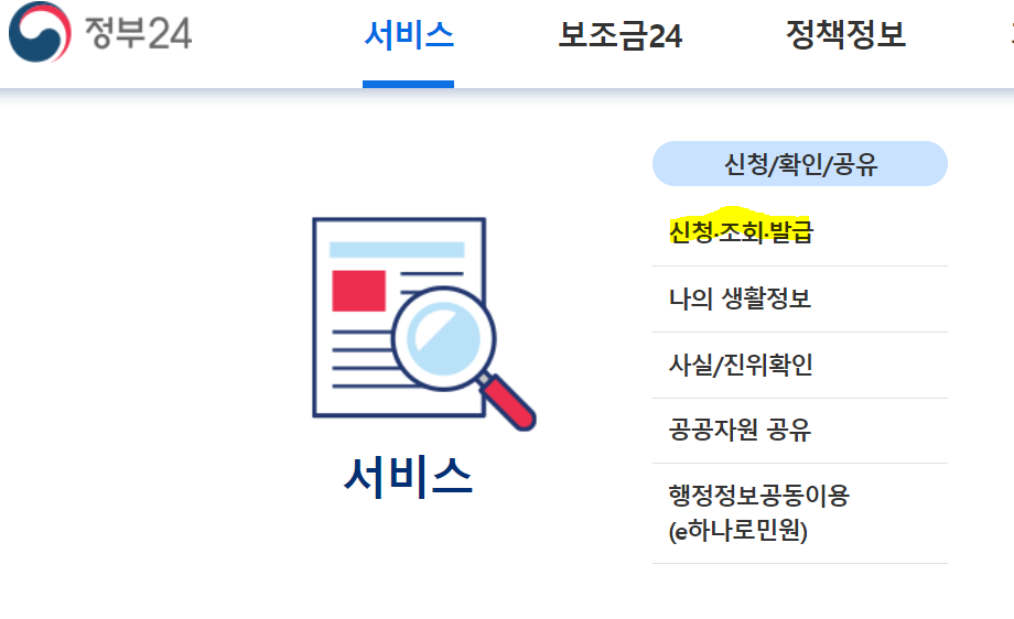 홈페이지를 접속 한 후 신청/ 조회 / 발급을 클릭합니다.