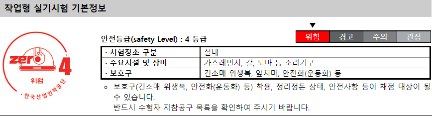 일식조리기능사는 칼봐 불을 사용하기 떄문에 안전등급 4등급의 시험으로 꼭 보호구 및 수험생 지참공구 목록을 확인하여 챙겨가셔야 감점을 당하지 않으니 꼭 챙기시길 바랍니다.