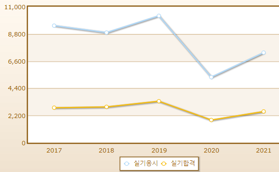 연도별 일식조리기능사 실기시험 합격률이며 2021년 기준 응시자 수는 7,287명으로 그 중 합격자는 2,527명입니다.