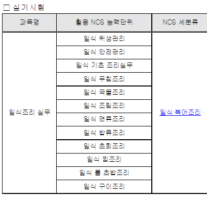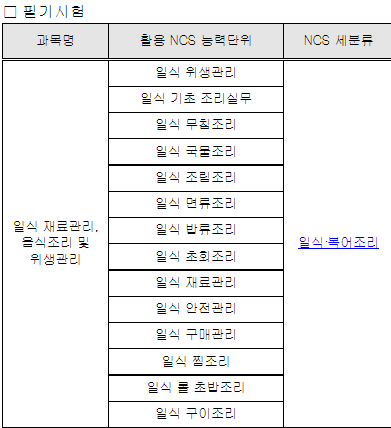 일식조리기능사 시험은 국가직무능력표준(NCS)를 기반으로 시험을 보게되며 시험 과목은 아래와 같습니다.