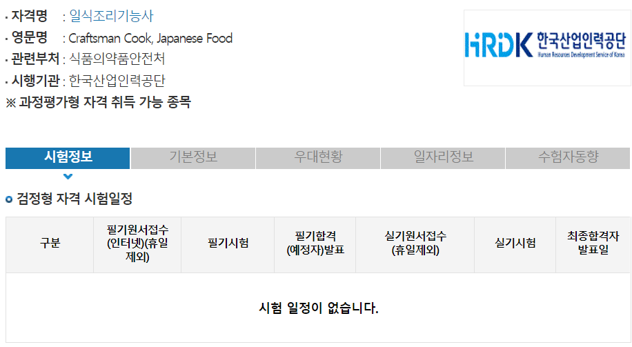 일식조리기능사 시험일정 및 시험과목