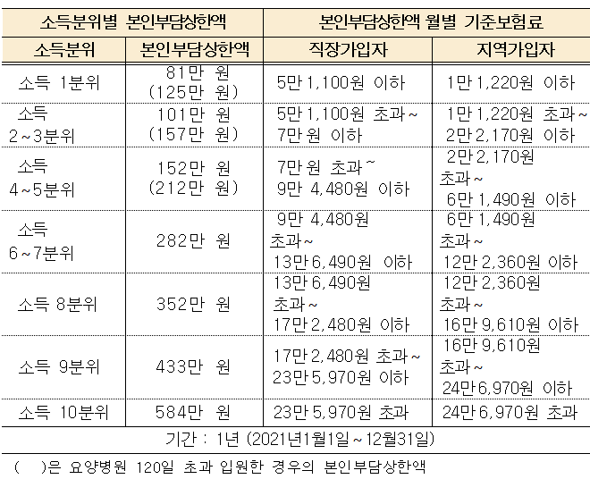 소득분위별 본인부담상한액 및 월별 기준 보험료