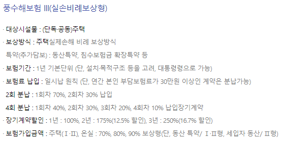 정부에서 보험료를 70% 이상이나 지원해주기 때문에 요즘 태풍 피해도 많고 추후 언제 생길지 모르는 재난에 대비하여 가입해두는 것이 좋습니다.