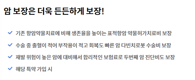 - 암 다빈치로봇 수술비 : 보장개시일은 최초 계약일부터 90일 지난 날의 다음날이며, 최초 보험가입 후 180일 미만에 보험금 지급 사유가 발생한 경우 75% 감액하여 지급하며, 180일 이상 1년 미만에 보험금 지급사유가 발생하는 경우 50% 감액하여 지급, 특정암(갑상선암 및 전립선암)의 경우 가입금액(각 세부보장 가입금액 기준)의 25%를 지급