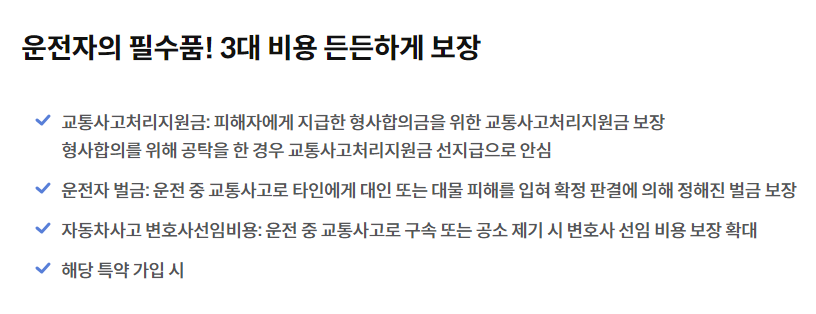 - 형사처벌 대상 사고(도주, 음주, 무면허 사고, 약물 상태 제외) 발생 시 보상합니다.