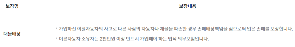 대물배상 : 다른 사람의 자동차나 재물에 손해를 입힌 경우 보상