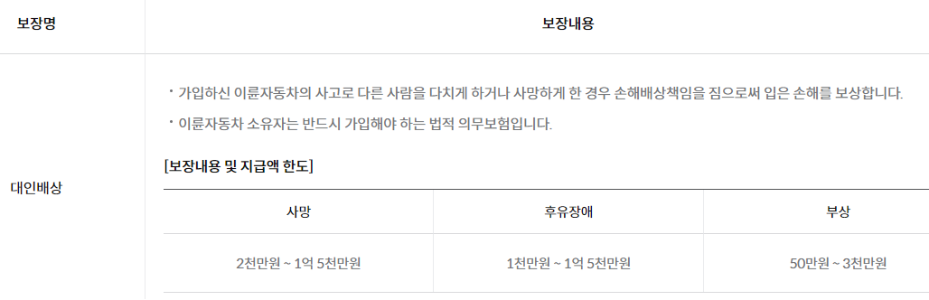 대인배상 : 다른 사람에게 상해, 사망 등 손해를 입힌 경우 보상