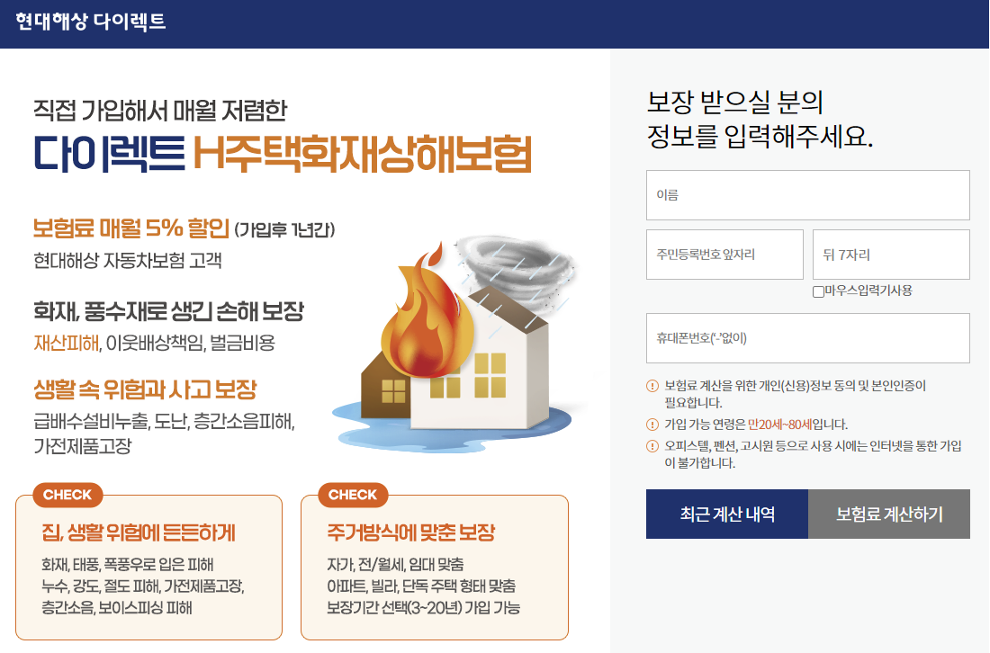 현대해상 다이렉트 H주택화재상해보험 보험료 조회하러가기