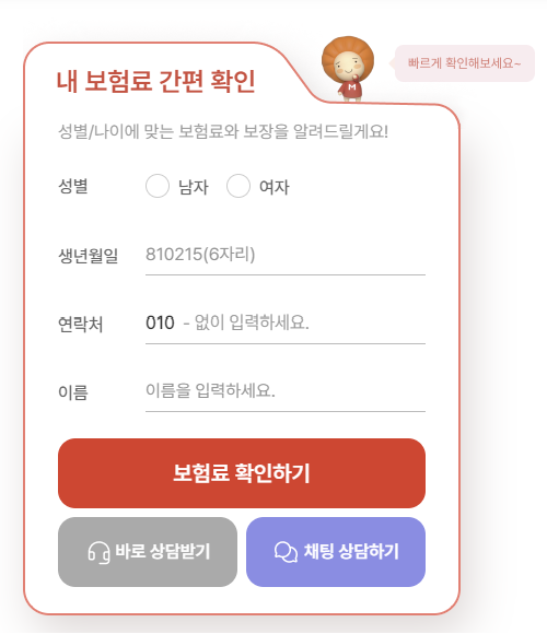 성별, 생년월일, 연락처, 이름을 입력하고 보험료 확인하기를 클릭합니다.