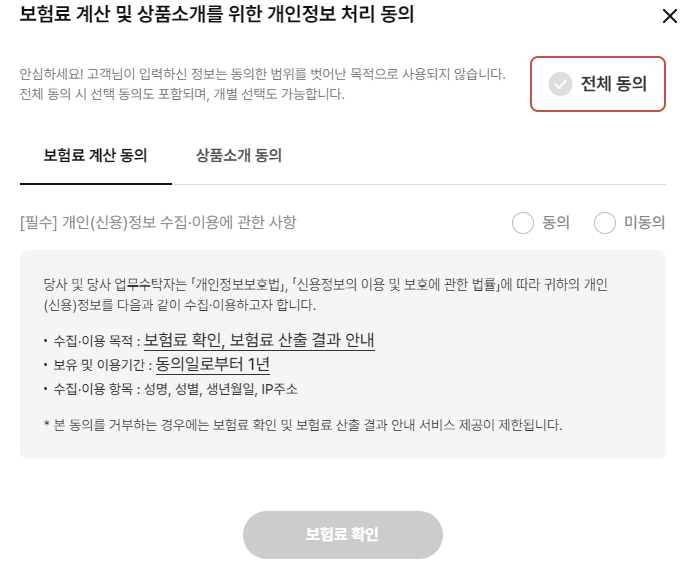 보험료 계산은 동의하고 상품소개 동의는 하지 않으셔도 됩니다. 상품 소개는 전화가 와요 ㅎㅎ..