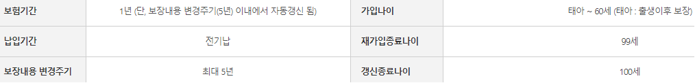 - - 보장내용 변경주기 5년 재가입형으로 관련 규정상 1년단위로 보험료가 변경되며(모든 보험사 공통) 5년 만기후에는 재가입을 통해 최대 100세까지 보장을 받을 수 있습니다.