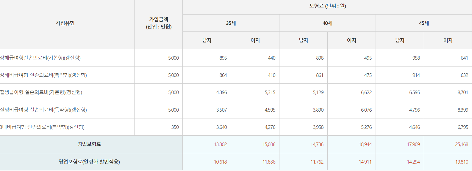 - - 위 예시 보험료는 실손의료보험 안정화 할인 적용 전 금액입니다. 실제 납입하실 금액은 영업보험료(안정화 할인적용) 입니다.