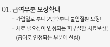 2. 피부질환, 불임 관련 질환, 선천성 뇌질환 등 보장이 안됐었던 질환에 대해서도 급여로 인정된 부분은 보장이 가능하게 되었습니다. 피부질환의 경우 심한 농양이 발생해서 치료 필요성이 인정되는 경우, 보장 대상이 될 수 있고요. 보험에 가입하고 2년이 경과되면 불임, 습관성 유산, 인공수정 관련 합병증에 대해서도 급여로 인정된 부분은 보장을 받으실 수 있습니다. 선천성 뇌질환은 태아 때 실손보험을 준비하셨다면 급여로 인정된 부분은 보장을 받을 수 있습니다.