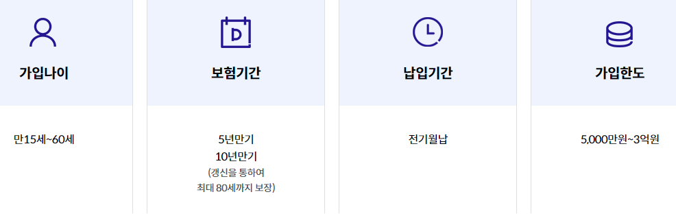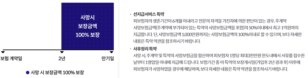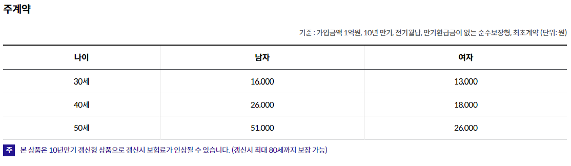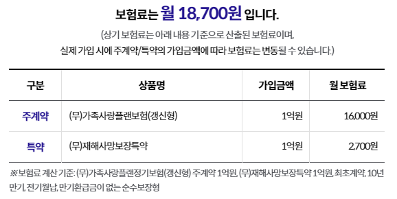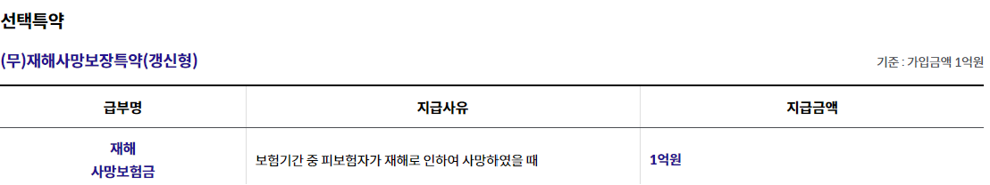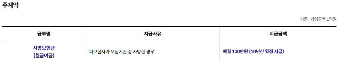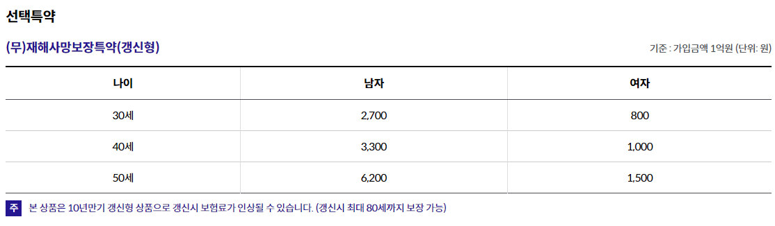 주계약 가입금액 1억원, 재해사망보장특약(갱신형) 1억원 10년만기, 전기월납, 순수보장형