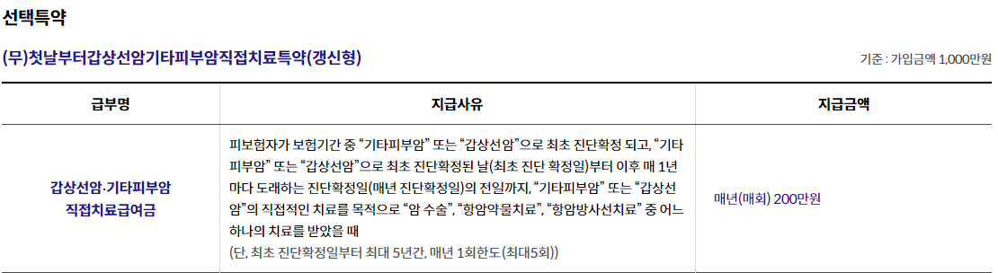 5. 최초 진단확정일로부터 이후 5번째로 도래하는 매년 진단확정일의 전일 이전에 보험기간이 종료되더라도, 최초 진단확정일부터 이후 5번째로 도래하는 매년 진단확정일의 전일까지 갑상선암∙기타피부암직접치료급여금의 지급사유가 발생한 경우 갑상선암∙ 기타피부암직접치료급여금을 지급합니다.