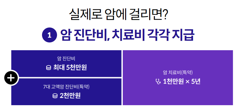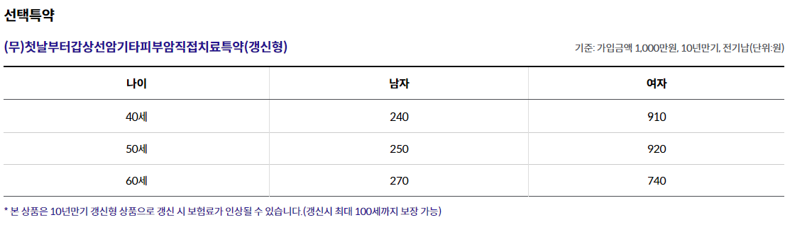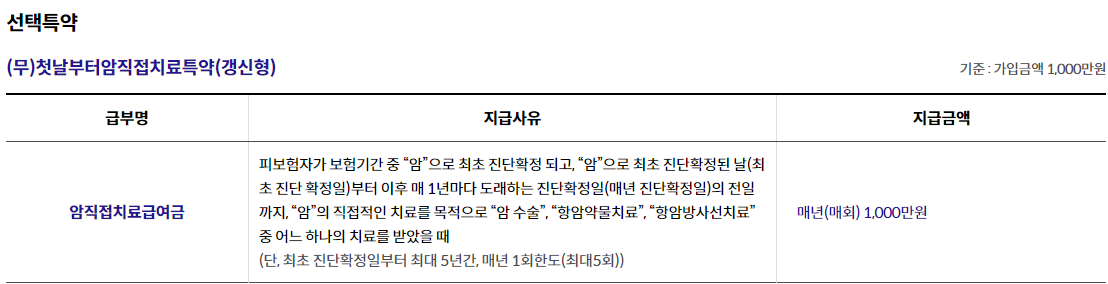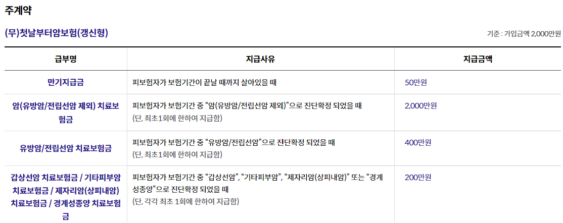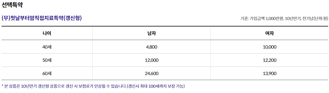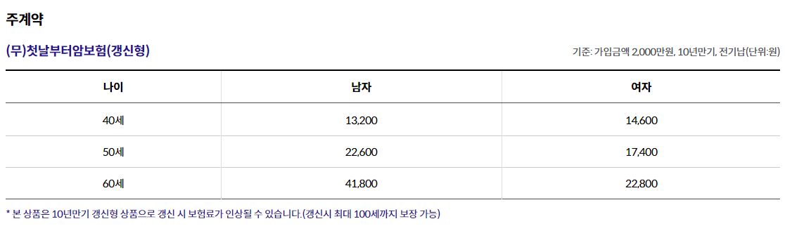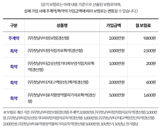 (무)첫날부터암보험(갱신형) 5천만원, (무)첫날부터7대고액암진단특약(갱신형) 2천만원, (무)첫날부터암직접치료특약(갱신형)1천만원 가입 기준,