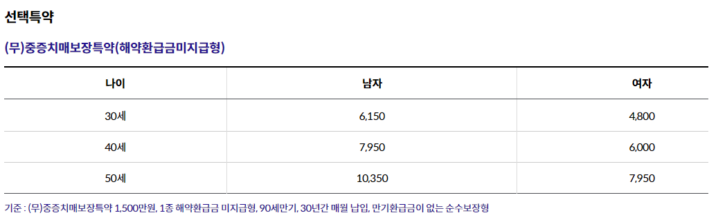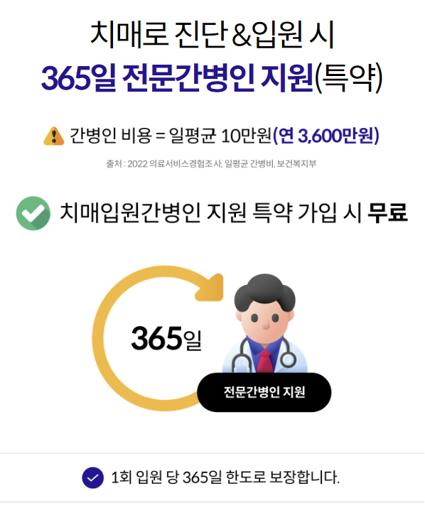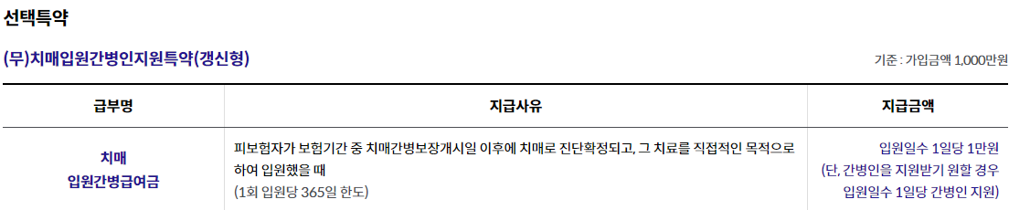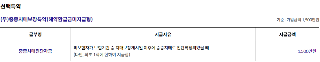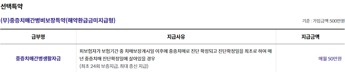 - 7. 중증치매간병생활자금은 중증치매 진단확정일을 최초로 하여 매년 진단확정일에 생존한 경우 지급하며(최대 종신지급), 해당연도에 대하여 중증치매간병생활자금을 12개월동안 확정 지급합니다.