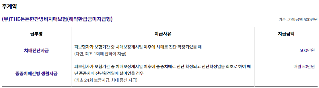 - 8. 중증치매간병생활자금 수령 중 보험기간이 종료되더라도 매년 중증치매 진단확정일에 피보험자가 생존한 경우 중증치매간병생활자금은 보험기간 만기와 관계없이 지급합니다.
