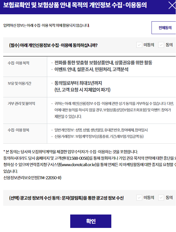 보험료 확인을 위한 개인정보 수집 및 이용동의에 동의를 한 뒤 확인을 클릭하면 보험료는 바로 조회됩니다.