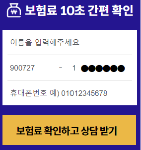 먼저 이름, 생년월일, 휴대폰번호를 입력 후 보험료 확인하고 상담 받기를 클릭합니다.