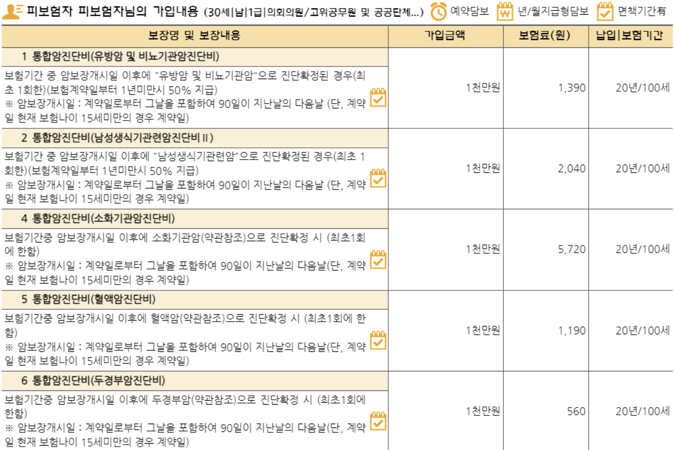 이런식으로 다양한 보장에 가입금액 등이 나오는데 실제로 조회해보는 것이 가장 정확하니 직접 한번 조회해보시기 바랍니다.