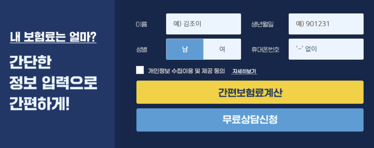 우선 이름, 성별, 생년월일, 휴대폰번호 입력 후 개인정보 수집이용 및 제공 동의를 체크하신다음 간편보험료계산을 클릭합니다.