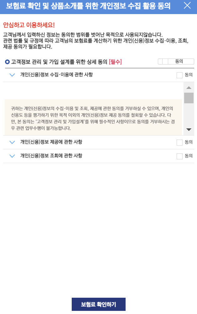 보험료 확인을 위한 개인정보 수집 활용 동의 후 보험료 확인하기를 클릭하면 보험료가 조회됩니다.