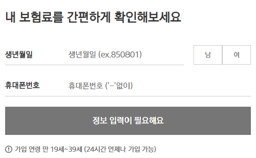 보험료 조회방법은 간단합니다. 생년월일, 성별, 휴대전화번호 후 보험료 계산하기를 클릭합니다.