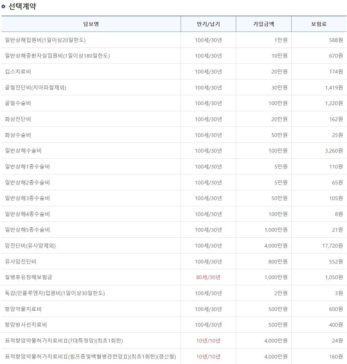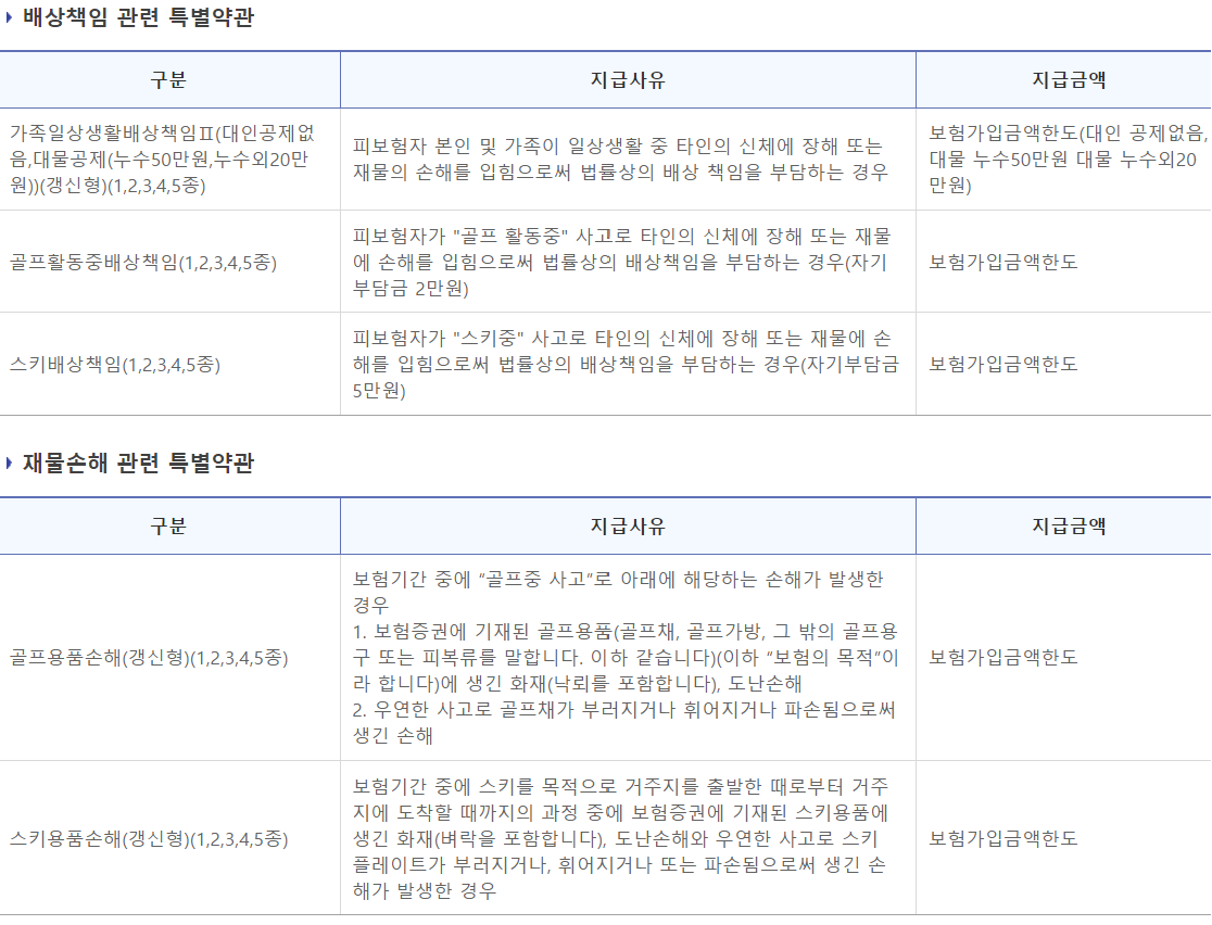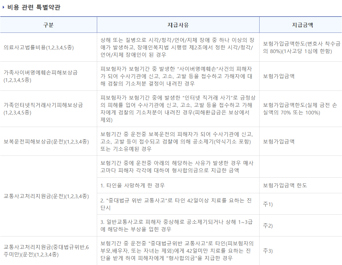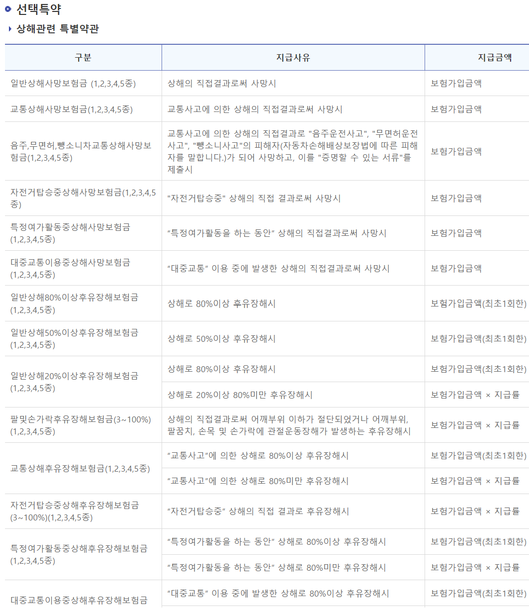 기본계약은 위와 같으며 선택특약은 ,상해, 질병, 배상책임, 재물손해, 비용 관련 특약 등 다양한 특약이 있습니다.