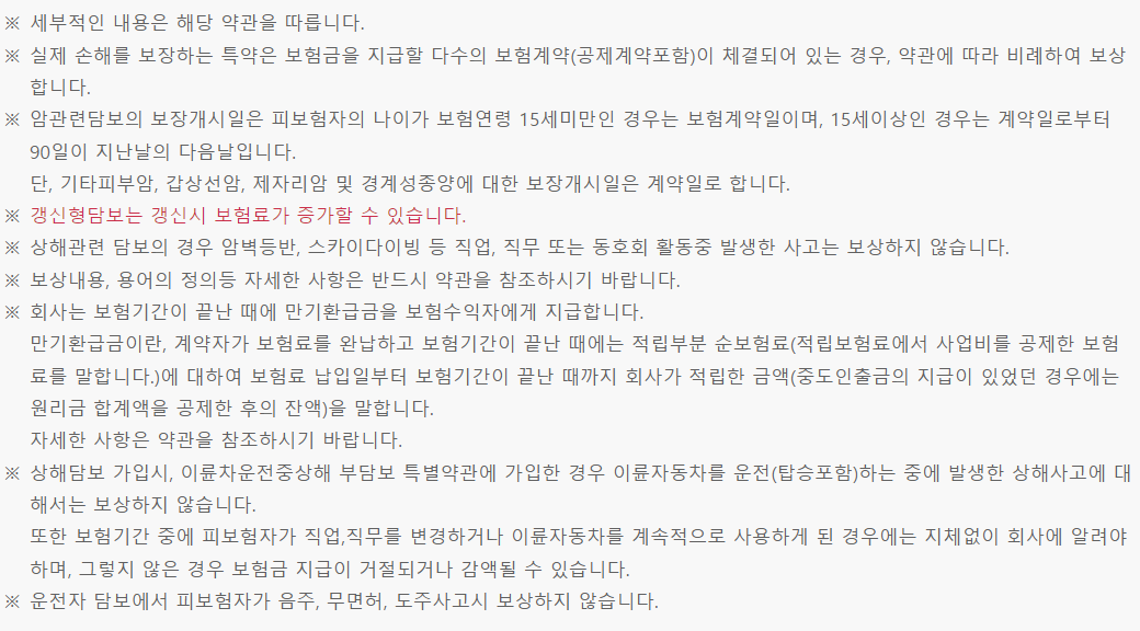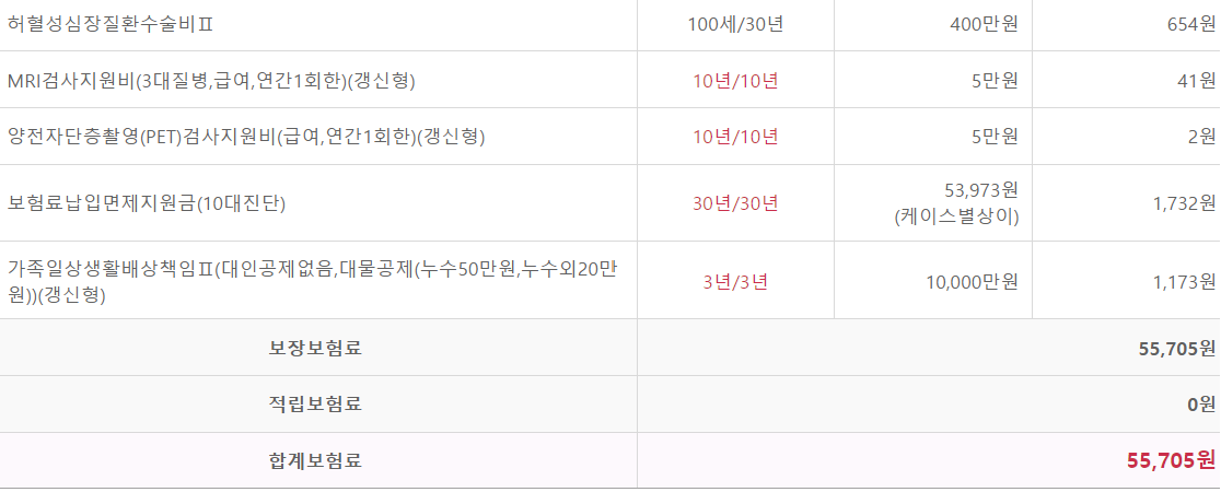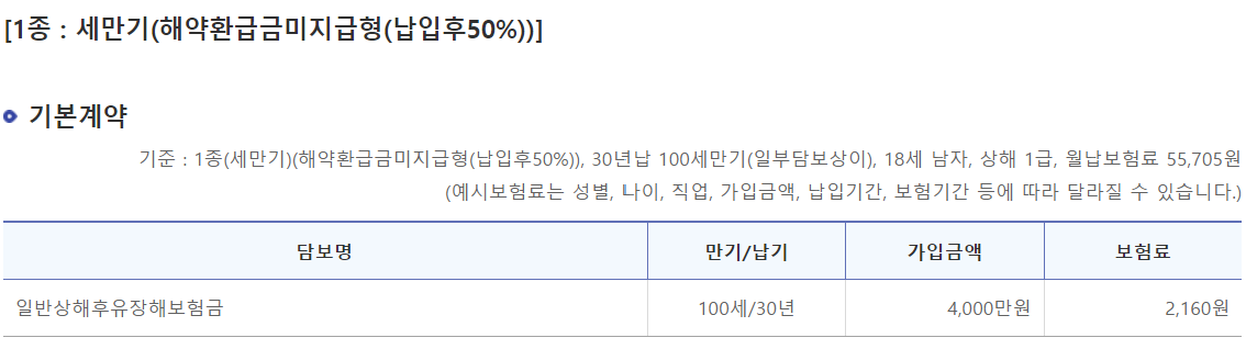 위 보험료는 기준 : 1종(세만기)(해약환급금미지급형(납입후50%)), 30년납 100세만기(일부담보상이), 18세 남자, 상해 1급, 월납보험료 55,705원