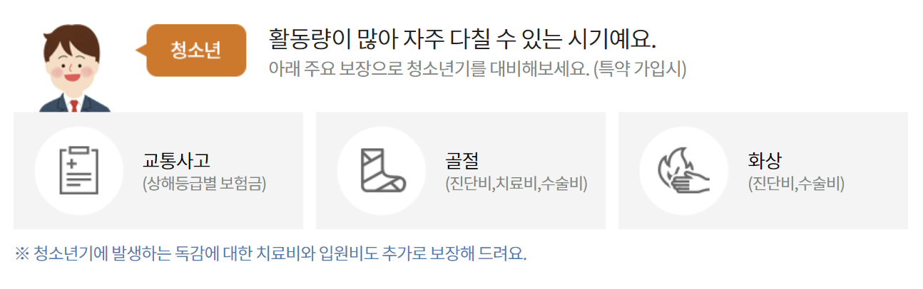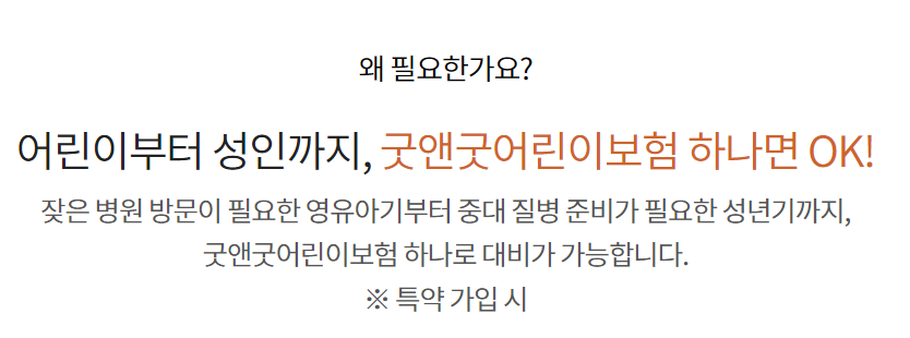이 상품은 어린이부터 20대까지 가입하는 굿앤굿 어린이 보험으로 성장 단계별 폭넓은 보장으로 어린이부터 성인까지 보장해주며 만일 20대라하여도 20대 어른이도 가입 가능합니다. 0세부터 30세까지 가입 가능하며 30년 만기 가입 시 30년 동안 보험료는 오르지 않는 보험 상품입니다.