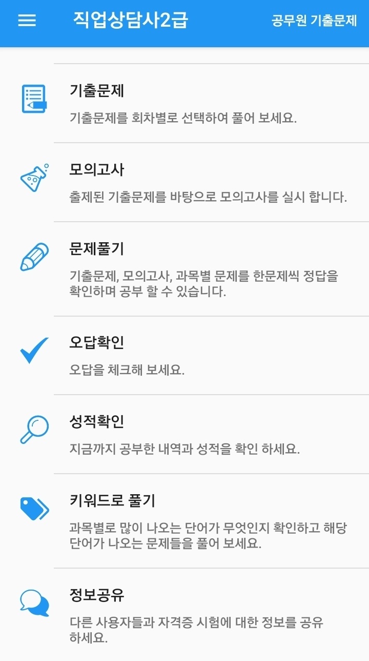 자격증 및 공무원 시험 공부를 할수 있는 기출문제앱 입니다!! 100종목 이상의 자격증 기출문제와 2007년부터 2018년 상반기까지의 공무원 시험 기출문제를 풀어 볼 수 있습니다. 1. 기출문제 기