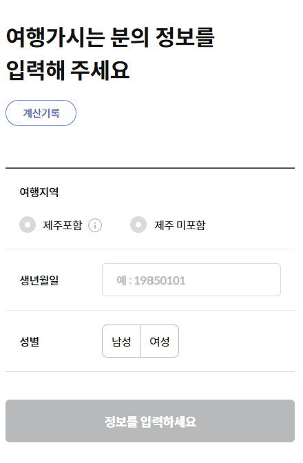 제주포함,미포함 및 생년월일, 성별 입력 후 다음을 클릭합니다.
