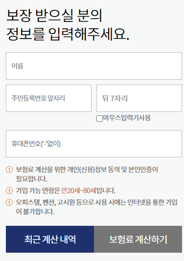 보험료는 주택 정보 가입자 정보 등 여러 조건에 따라 달라지므로 직접 조회해보시면서 하는 것이 좋습니다.