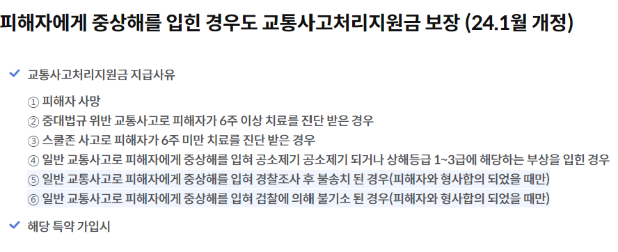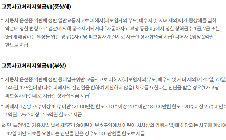 ※ 단, 특정범죄 가중처벌 등에 관한 법률 제5조의13(어린이 보호구역에서 어린이 치사상의 가중처벌)에 따른 벌금형이 확정된 경우 3,000만원 한도로 지급