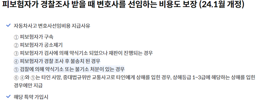 자동차 운전중 교통사고로 타인을 사망에 이르게 하거나 「자동차사고 부상 등급표」에서 정한 상해등급에 해당하는 상해를 입혀 아래의 ① 내지 ⑦로 인해 발생한 변호사선임비용 중 실제로 부담한 금액을 1사고마다 아래의 한도로 보상