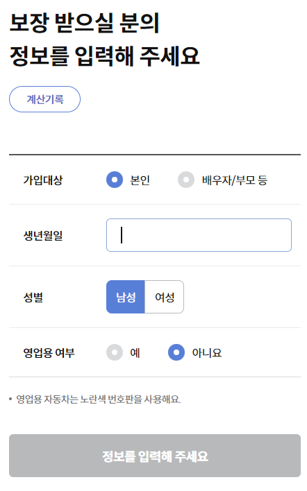 우선 가입대상 선택 후 생년월일, 성별, 영업용 여부 체크 후 보험료 계산을 누르면 다음과 같이 보험료가 계산됩니다.