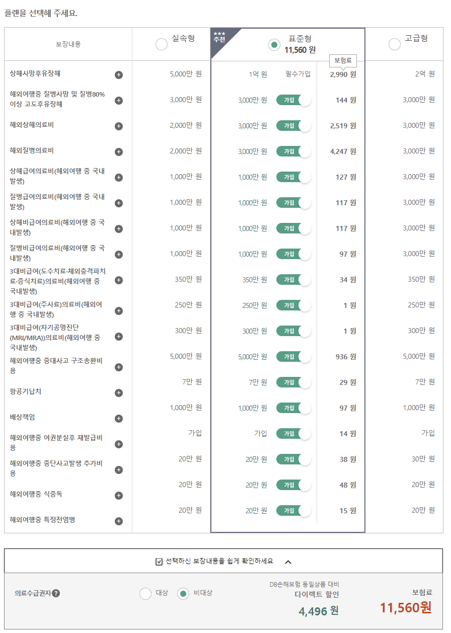 보험료는 플랜마다 달라지므로 직접 조회해보시면서 진행하시고 보장은 뺼 수 있으니까 만일 국내 실손의료비 보장에 가입되어 있으시다면 국내껀 빼고 가입하시는게 저렴하게 가입 하실 수 있습니다.