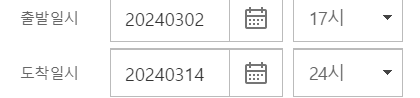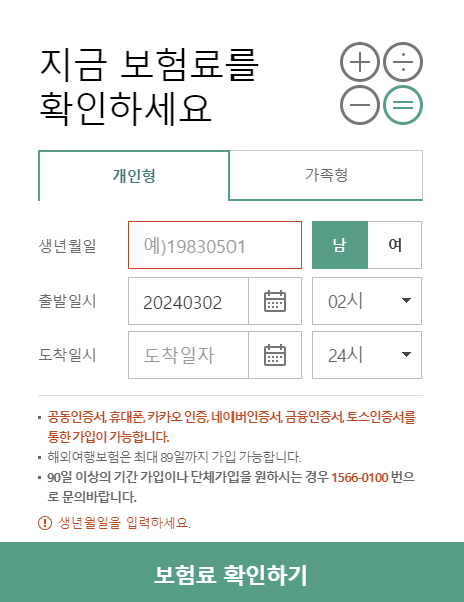 생년월일, 성별, 출발일시, 도착일시 입력 후 보험료 확인하기를 클릭합니다. 저는 아래와 같이 기간을 설정했습니다.