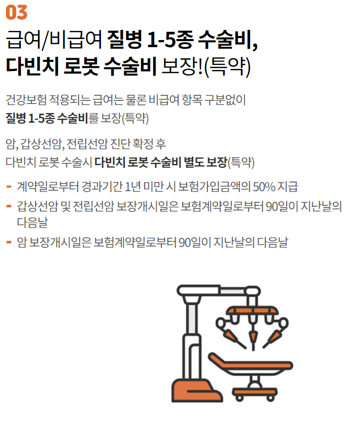 보장개시일 이후에 “암(갑상선암및전립선암제외)”으로 진단확정되고 그 직접적인 치료를 목적으로 “다빈치로봇수술”을 받은 경우 보험가입금액 지급(최초 1회에 한하며, 계약일부터 경과기간 1년 미만시 보험가입금액의 50% 지급) ※ 약관상 "암"에 대한 보장개시일은 보험계약일로부터 90일이 지난날의 다음날로 합니다. ※ "암"의 정의는 보험약관에 정의한 용어를 따릅니다. |